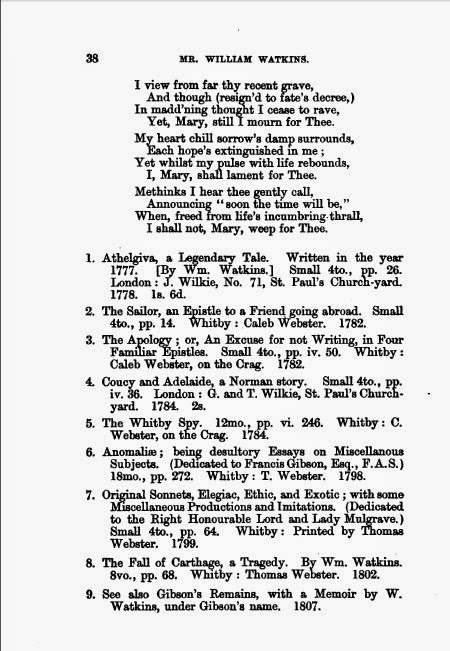 William Watkins was in Whitby 1755. He was a friend and contemporary of Francis Gibson (on this) whose fellow pupil he was with Lionel Charlton. George Markham Tweddell proposed to cover William Watkins (or at least The Watkinses) in a proposed 2nd or 3rd volume of Bards and Authors of Cleveland and South Durham 1972. Tweddell covered Lionel Charlton in the first and only volume and so would be familiar with William.. The 2nd or 3rd volumes never came out but earlier in 1867 Rev Gideon Smales covered William Watson in Whitby Authors and their Publications. John Watkins, the Chartist writer was William’s uncle. (Source