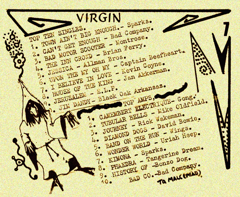 Coventry Virgin Record Store Charts 1973 / 74 for Hobo Magazine