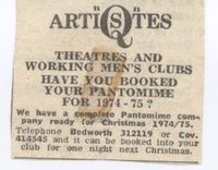 “A showcase of talent has been among the activities of Q Artistes club. Talent in a variety of guises emerged on the stage of the Building Trades Hall, including fire eaters, singers, songwriters, dancers etc. They were watched by Les Cocks of New Faces with a view to selecting some of the artists for the next series of the program. The results will not be known until the end of the month. Their disco at St. Saviours Hall is no longer operational and Q are looking for new and suitable premises for providing a variety of activities in the arts.”
