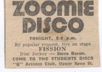 Q Artistes first promotion was the Zoomie Disco which provided an outlet for local bands like Mad Cat Molly, Warrior and Fission at St. Saviour’s Hall near the Butts.