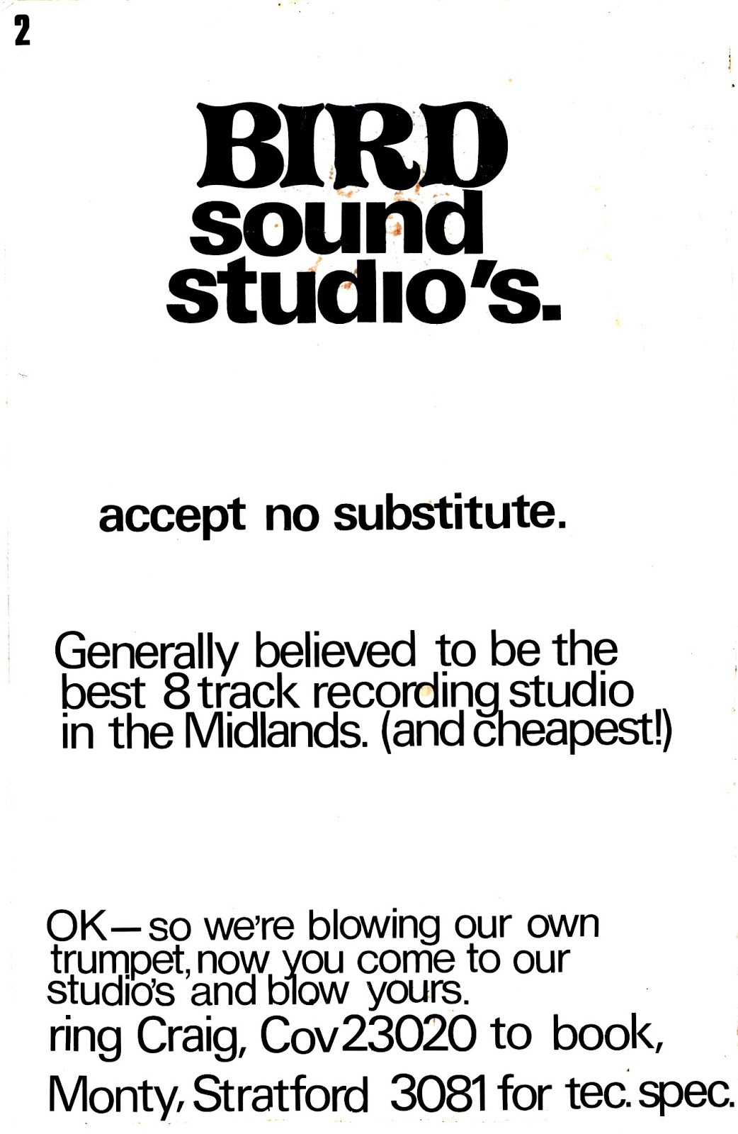 “Bird recording studios at Snitterfield, not far from the land of Shakespeare, has been converted into an 8 track stereo unit and will re-open at the beginning of February. The rates of recording there will remain the same as they were for the previous 4 track – for the first six weeks of opening. The rates at the moment are £4 an hour inclusive of editing. Copy tapes 50p, sur-charge of £1 for use of the master tape. For discs (albums) 6 cost around £9 and a 1000 cost 75p each. This is a 24 hour service. Session musicians can be supplied on request with of course additional charges.