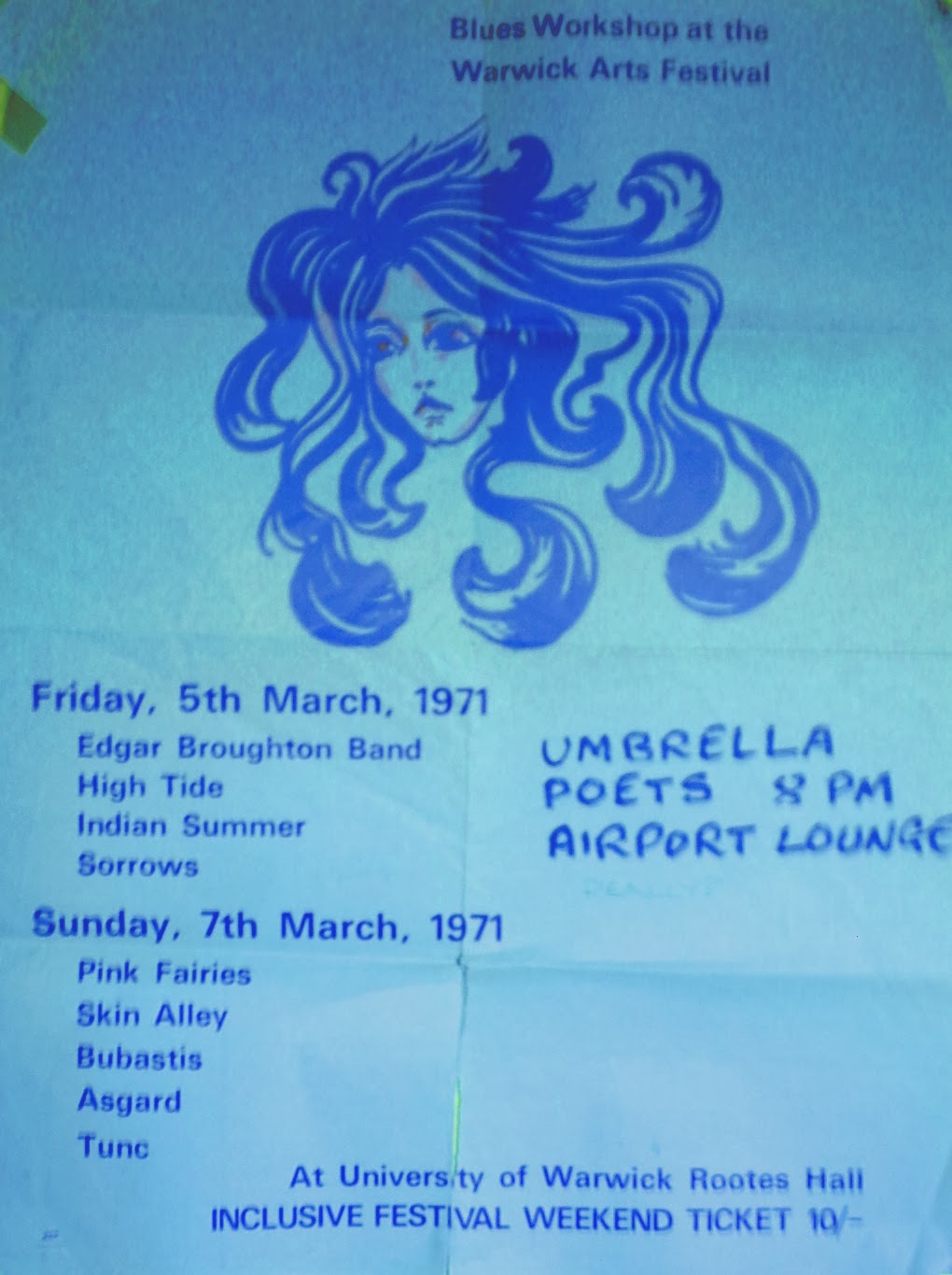The next was Ghost, (follow link for more info) another Birmingham band who played on Friday September 18th 1970 with Coventry progressive band Asgard. And later on Audience. I think we might have used them for the proposed second Umbrella Music Marathon in 1971 as we had some Birmingham bands lined up but the event didn’t come off as the Umbrella was scaling down in preparation for a change of premises as the Umbrella club building was due for demolition towards the end of 1972.