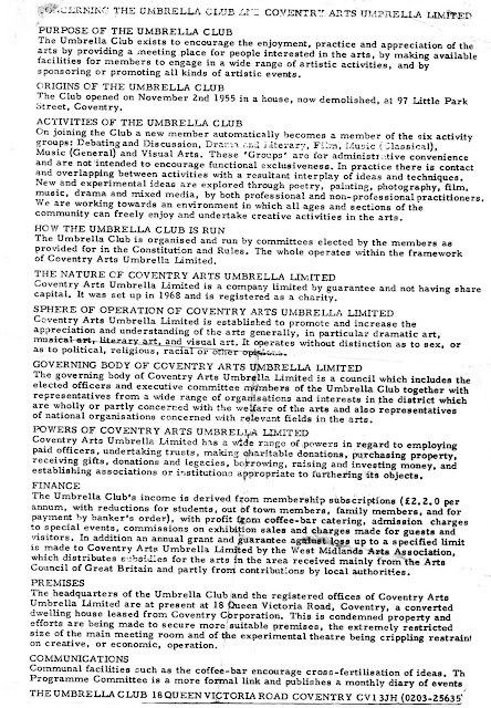 This sheet the essence of the constitution of the Coventry Arts Umbrella Ltd – A company limited by guarantee and not having share capital set up in 1968 and registered as a charity. The Umbrella had of course being going since 1955 but obviously achieved charitable status in 1968. This may have coincided with them achieving West Midlands Arts funding – I’m not sure. This site gives details – http://opencharities.org/charities/255821 It ceased to be one in 2001 according to this site.