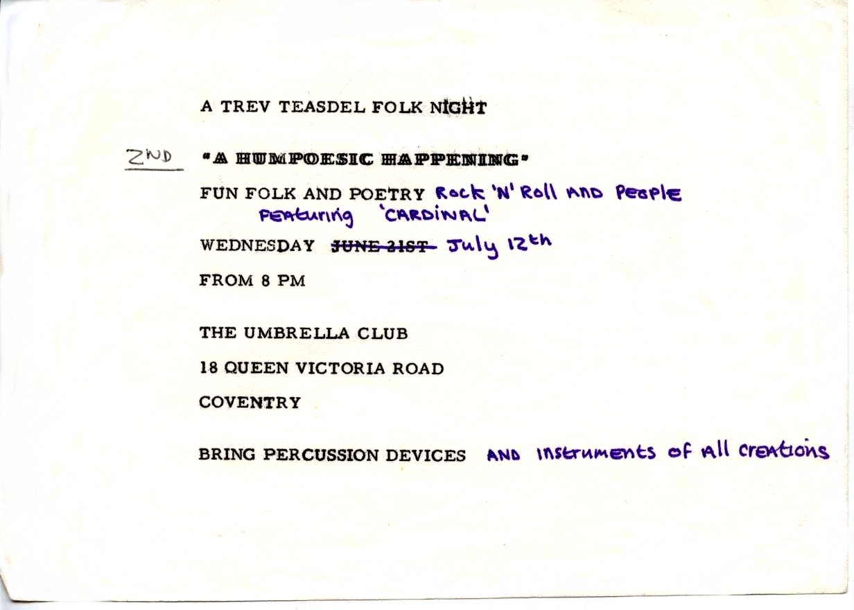 “A folk based session featuring a guest folk group from Coventry called Toadstool, whose members include John Brown, who is no stranger tot he Umbrella club. there will other singers, musicians and poets present at what should be a very enjoyable evening of poetry and folk. Look out next month for an event featuring a well-known poet.(Could it be Roger McGough?). (April 71 – Umbrella Programme).