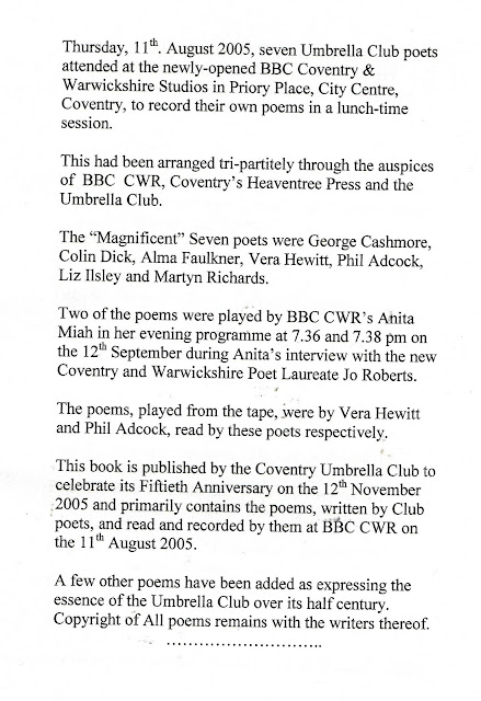 Martyn Richards recalls ” Coventry’s Heaventree Press, with whom club and members had established published links, arranged an hour-long recording session for Umbrella Poets. This took place at the re-emerging BBC Radio Coventry & Warwickshire Station. Seven poets read 23 poems during the lunch-time of the 11th August 2005.