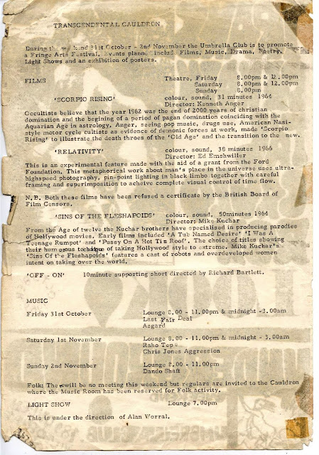 The Transcendental Cauldron was an underground fringe arts festival or ‘happening‘, to take place during Halloween, which it’s organisers hoped would bring the Umbrella more in line with what was happening at places like The Arts Lab in Drury Lane.