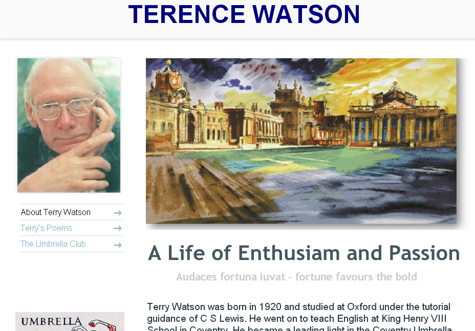 The Coventry Arts Umbrella Club has published a selection of Terrence Watson’s poems under the editorial direction of Bob Wright and this book is now available at all major booksellers (including Amazon). The publisher is Earlsdon-based Takahe Publishing Ltd. Terry was a leading light in the Coventry Umbrella Club that was formally established in 1955 and continues to this day.