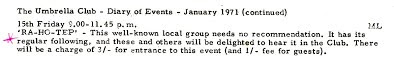 Below – Ra Ho Tep at the Coventry Arts Umbrella Club – put on by Trev Teasdel 1971 but it was not the first time they played there. Advert from the Coventry Evening Telegraph.