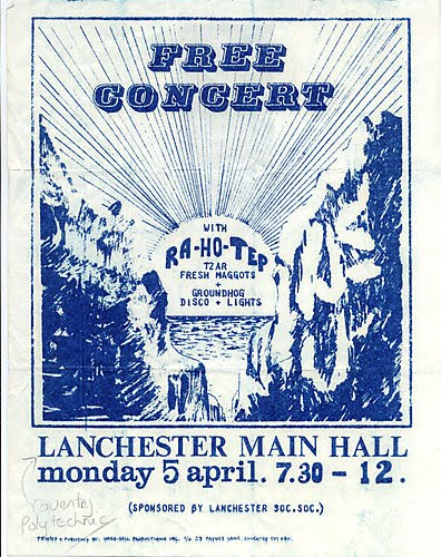 Below – Ra Ho Tep at the Lanch Poly Coventry 1971 with Fresh Maggots and Al Docker’s band Tsar.