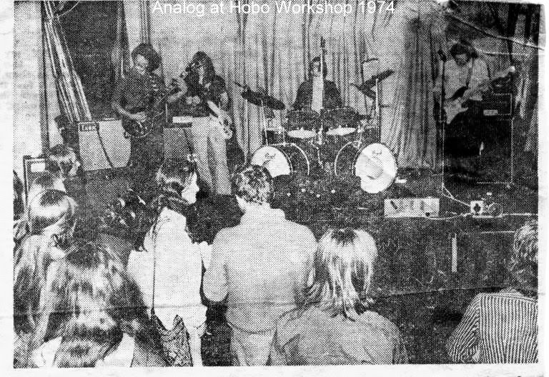 Above – Analog (jazz rock) on stage at the Hobo Workshop gigs summer 1974 – it was their first gig and they played a second time for us in October 74 and were mentioned in Hobo magazine earlier in that year.