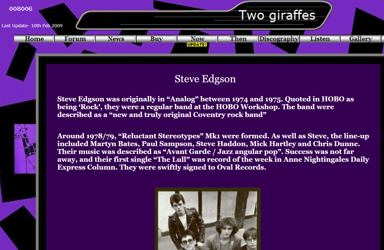 “Around 1978/79, “Reluctant Stereotypes” Mk1 were formed. As well as Steve, the line-up included Martyn Bates, Paul Sampson, Steve Haddon, Mick Hartley and Chris Dunne. Their music was described as “Avant Garde / Jazz angular pop”. Success was not far away, and their first single “The Lull” was record of the week in Anne Nightingales Daily Express Column. They were swiftly signed to Oval Records.