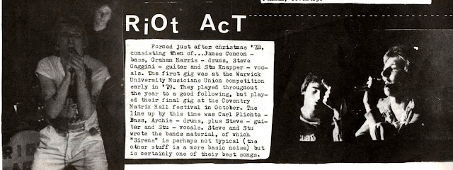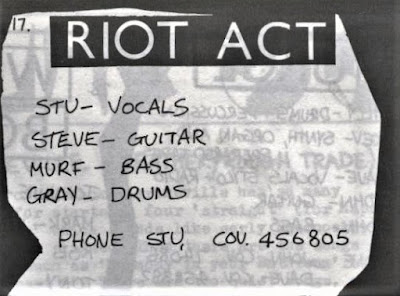 A Riot Act track was featured on Martin Bowes – Alternative Sounds album 1980 Sent From Coventry. The track Sirens.