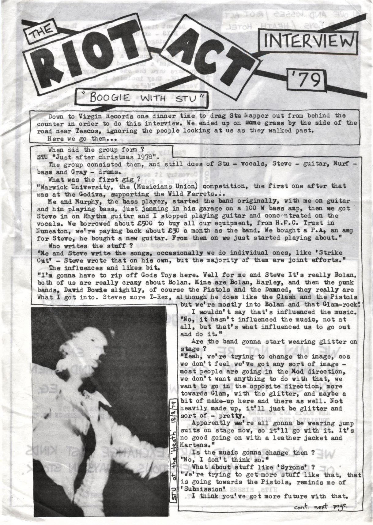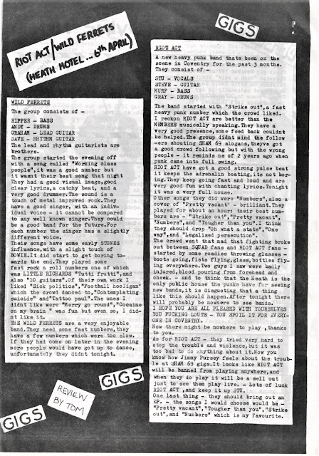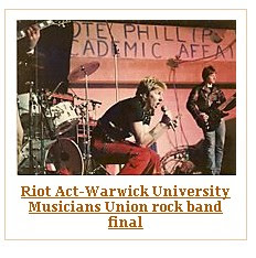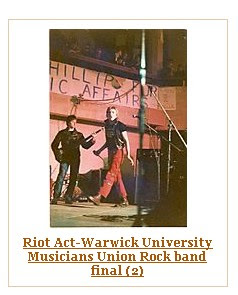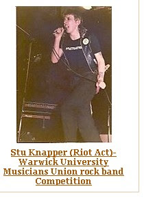 Schools out…….Finding bigger and better rehearsal space turned out to be easy. We found out that you could hire the music rooms at any of the nearby schools via the council offices in the city centre. So for the princely fee of around £4 a go, we hired the music room at our old school, Binley Park Comprehensive two nights a week, utilising my future brother in law’s (Alistair) work’s Tartan van to transport our gear to and from Murph’s garage twice a week. Now for the drummer: Steve and I had grown up with a good friend called Will Simpson (Sanka) who had always told us that he had a drum kit and had been having lessons. The reason that we had not approached him earlier was that he had not shown much interest in music since leaving school and therefore we had erased him from our list of likely band members. In our early teens I had been to see The Glitter Band and Sparks (Kimono My House Tour) with him so I knew that he had at one time been vaguely interested. So one evening we invited Will to the school with his kit and he began to rehearse with us. After around three or so rehearsals it was painfully obvious that he couldn’t really play. He tried so hard but as any band will tell you: if you have no confidence in your drummer you may as well forget it!! We let Will go, it wasn’t good because as I said he had been a friend for many years and had been part of our lives for such a long time I think that’s why persevered with him for a couple of weeks. had the phone number of his parent’s house. He had been a member of the “Coventry Corp of Drums” right through school and I was pinning my hopes on the fact that he had a full kit. I called him and asked if he would meet up with the band with an outlook to joining us. As luck would have it Gray had a kit and had been playing at weekends in working men’s clubs with various organists playing foxtrots and quicksteps and was longing to escape this musical hell. He jumped at the chance to come along and try his hand with the band!! From the moment Gray hit the skins for the time in rehearsal we knew we had a proper band. He was phenomenal. Our own compositions suddenly sprang into life and became full blown bona-fide punk songs. Riot Act were ready to snarl, sneer and gob their way onto the Coventry music scene!! As you can see from the photo caption above I had dropped the guitar to concentrate on the vocals. I had never felt comfortable that I could give my best performance with the constraints of dragging a guitar around the stage with me. And anyway Steve was getting better and more confident as the weeks rolled by especially since Gray had joined giving us the benefit of his pounding rhythm and perfect timing. Now I could be Iggy, Johnny, Joey or just me of course. Ever since my brother Phil and told me to watch some footage of Iggy Pop jumping into the crowd and rubbing peanut butter over the audience I had wanted to be a frontman. My ethos was, and still is, that if your on stage with Stu Knapper and you want to own it, you better be prepared to fight for it, because I don’t give it up for anyone!! By now the word had spread that the band had moved to the school and the same kids from the village began to turn up. However, this time they were not alone!!! They now had kids from Willenhall and Ernesford grange in tow and on some nights there would be 30 or 40 kids hanging around the school. It was a situation that we thought may get out of hand with regards to vandalism on the school site so we decided that we would invite them into the music room to watch us rehearse. On one occasion the caretaker turned up to find the music packed with kids and asked us what was going on? We played innocent and told him that we didn’t know them and they just walked in through the door and sat down. I’m not sure if he believed us but he just turned and walked out and left us to it. To be fair we thought that they would soon get bored and find some other outlet to occupy there evenings but as the weeks rolled on you could see the kids change in their appearance. Many were already punks but some were still wearing flares etc…it wasn’t long before the spiky hair cut and Oxfam clothes replaced the fashion garments worn by the current crop of “Top of the Pops” pop stars. Queen and Pink Floyd T-Shirts had been replaced by the Pistols and the Clash….These kids were ready for a gig!! And so were the band!! Carl, Archie and Wuff were installed as the management, and were now responsible for all gigs and promotion. I can’t remember who came along to rehearsals with a small section cut out of “The Coventry Evening Telegraph” detailing a rock band competition to be held at Warwick University but we decided that this would be our focus for the next 8 weeks. We entered the competition, were given a date of the heat (Heat 1), and started to rehearse for the 20 minute set that each group had been allocated. If memory serves me correctly David Hearn (Hearnie) happened along at this time and quickly became our sound man. Hearny had been in the same classes as Gray and myself throughout school so we new him well and were pleased that he was on board with us. As the weeks rolled on we rehearsed the set as if we were performing the gig over and over seeking perfection in performance and sound. In between we would continue to work on new songs but our aim was to tighten the 6 songs that we had chosen to showcase on the evening. All kinds of stories about the other bands in the heat started to filter through to us and we began to get nervous as the gig grew ever nearer. What if we finished last?? We decide it didn’t matter as long as we put in the best performance we had in us and we could walk away with our heads held high. As you can see our expectations were not very high! On the plus side, we now had a dedicated following of around 40 real hardcore fans that new every word to every song and were ready to spray paint “Riot Ac