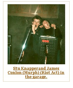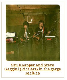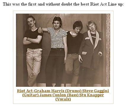 It must have been late 1978 in Binley Village when we began to sow the seeds that eventually grew into Riot Act. Me (Stuart Knapper), and my punky mates Archie (Stephen Ball), Wuff (Stuart Waugh), and Carl Plichta had embraced punk rock from day one (the summer of ’76) and had become regular faces at all of the punk hot spots in the city centre. We had seen them all: The Clash, The Pistols at Mr Georges (not the Lanch), The Vibrators, The Adverts, Sham, The Jam, The Stranglers, The Dead Boys, The Buzzcocks, Penetration, The Damned and The Flys. In 1977 we were either 16 or 17!! This was our time!! Our Moment!! Our Music!! They were crazy days: Local Ballroom Tiffanys had punk bands on every Tuesday and Thursday; Mr Georges night club had bands every week as well as pubs like the Hand and Heart in Hertford Street. I remember seeing “Menace” (GLC GLC your full of shit shit shit) at the Hand and Heart in the back room one Friday night. Pubs like the Bear Inn and the Swanswell Tavern welcomed us with open arms. I had always wanted to get a band together ever since I had seen Marc Bolan fronting T.Rex on TOTP playing Hot Love. My older brother Phil (see my Phil Knapper blog) was an excellent guitarist and had painstakingly helped me learn a few chords on his guitar over the years. So the four of us had talked and talked and talked about the band but it just never happened. This was due the fact that at the time, none of the others could play a note. So I turned to my life long friend Steve Gaggini who was sitting on the outside looking in, and only occasionally dipping his toes into the puke filled waters of punk rock. Like me, Steve was a mad T.Rex fan. Indeed, we had seen T.Rex twice together at the Birmingham Odeon the last time being March 17th 1977 with The Damned supporting and the added bonus of Steve and my wife to be Helen sitting on the stage with Marc Bolan due to the safety barriers giving way at the front of the stage . Steve could also play guitar!! Like me he was limited, but was a little further down the track than I was so we decided to start putting a band together. So Steve and I started to write songs together in his bedroom at his sister’s house. I can’t remember how we discovered that James Conlon (Murph) could play bass guitar but somehow we did, and soon began to rehearse in his dad’s garage in Penarth Grove in Binley. The three of us would get together two or three times a week and make a shit load of noise for the benefit of Archie, Wuff and Carl who were always in attendance. We would knock out covers of The Clash, T.Rex and even the Boom Town Rats spliced with our own early compositions. Pretty soon the noise and the word on the street spread around the village that some guys had a band and did concerts in a garage!! Very soon 15-20 kids would turn up to listen to us in the street as we played away behind the locked doors of the garage. It wasn’t long before Murph’s parents were receiving complaints from the neighbours about the noise from ever growing gang of spikey haired punk rockers hanging about outside the garage. It was at this juncture that we realised that we needed to do things fairly quickly: Find better rehearsal space and get ourselves a drummer!!!
