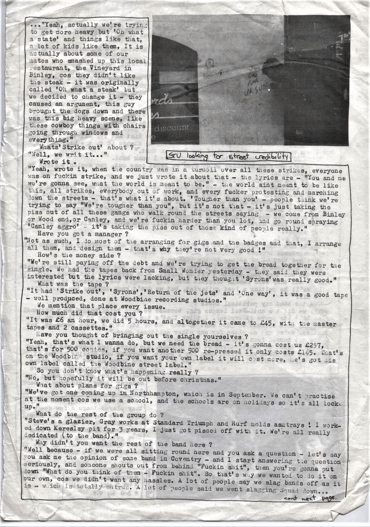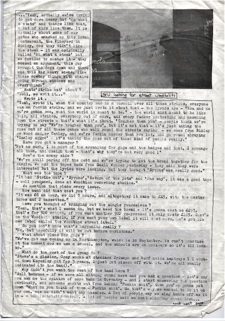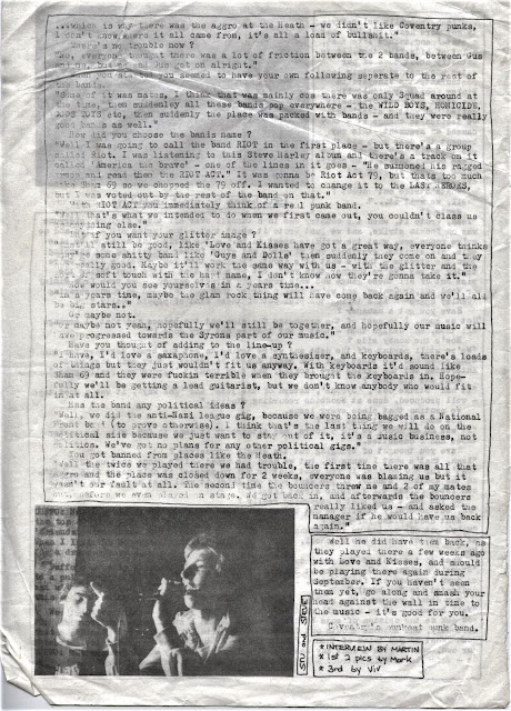 Well because – if we were all sitting round here and you ask a question – lets say you ask me the opinion of some band in Coventry – and I start answering the question seriously and someone shuts out from behind “Fuckin’shit”, then you’re gonna put down “What do you think of them – Fucking Shit”. So that’s why we wanted to do it our own, cos we didn’t want any hassles. A lot of people say we slag bands off as it is – which is totally untrue. A lot of people said we went slagging Squad down….which is why there was aggro at the Heath – we didn’t like Coventry punks, I don’t know where it all came from, it’s a load of bullshit.