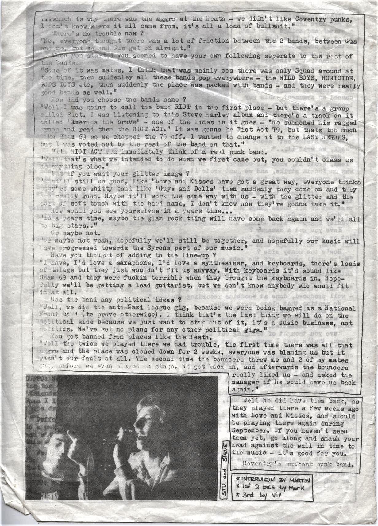 As a result of the riot the Heath Hotel was closed for two weeks for “refurbishment.” When it eventually re-opened the management had installed doormen to supervise the gigs. It was usually a couple of punch drunk locals who looked like they had gone a few unsuccessful rounds in the ring. Now although things had ended on an ok note that night, and we had taken up the offer for a couple of return gigs there was a nasty outcome from the whole affair. It was my first brush with political spin and I can tell you it left a horrible taste in my mouth. There were a couple of right wing NF bands doing the rounds in Coventry at the time. Without much support I might add! One of the bands was called “White Boss,” and had approached us to play a gig with them at some venue or other. We had of course declined their very kind invitation with a very firm “Fuck Off.” However, they went ahead and played the gig without incident. But to my surprise I walked into Virgin Records one afternoon and was confronted by John “Brad” Bradbury (Specials Drummer) and some other faces on the scene at the time and questioned about my political beliefs. As you can understand I was very taken aback and before answering any questions I asked the reasoning for the questions. I was then shown a NF/Right Wing magazine article claiming that the Riot Act “riot” at the Heath Hotel had in fact happened at the “White Boss” gig, but the most galling thing of all was that they claimed that we had played and the riot had been between black and white youths. I was fucking furious!! I was really pissed off that Brad and his buddies had even dared to think that I would be involved in that racist bollocks but mad as fuck that those NF wankers had dared to associate Riot Act with their bullshit belief. When we had started the band we honestly had no political vision, we just wanted to write songs and play to anyone who would listen to us. We now had an issue that we had to resolve as none of us wanted the band tagged with an NF image. This incident led to one of our most bizarre gigs: I can’t remember who approached who, but we signed up play at the “Anti Nazi League Rally” in Coventry during the summer. What a laugh we had!! Our stage that day was the back of a carnival float loaded with all of our gear and an entourage of punk rockers hanging off the side. We were pulled through the city at the head of a march of thousands all the way to either the Memorial Park or Hearsall Common I can’t remember which. Anyway, I remember the weather was at boiling point and it was a long slow journey and we belted out every song that we had about four times each. The great thing was that people kept handing us cans of beer as we made our merry but very sweaty way along the route. I remember some guy handing me a “Party 7” but he hadn’t opened it and I didn’t have the tools to do it either. As you can imagine the more beer we were given the more we drank and the float began to fill with empty cans and a lot of drunk punk rockers. Fuck knows how we managed to stay on the thing!! At one point as we puled into Trinity Street Steve broke a string on his guitar and as usual we had no replacement strings or guitars so David Hearn ran off to buy one from a local music shop on route to the park. This of course rendered Steve into playing a 5 string guitar for a small section of the journey. I tell you how mad a day it was: As we were winding our way through the the streets of Coventry playing our merry tunes we of course were escorted by Coventry’s finest boys in blue some of whom, to our amazement (pointed out to the band by Carl) were seen to be mouthing all the words to our version of the Pistols classic “Pretty Vacant.” You didn’t see that very often Coventry in those days I can tell you!! Now By the time we reached the destination we were well and truly wrecked!! There was a big stage set up at the park and a big line up of bands but sadly I can’t remember much more about it, maybe due to my memory but probably because I was so pissed. I do remember Carl chasing the organisers for the grand sum of £30, our payment for the day. I wish I had some photos of that day but sadly I don’t. But if anyone reading this blog has some please contact me. One things for sure we firmly buried the NF tag!!