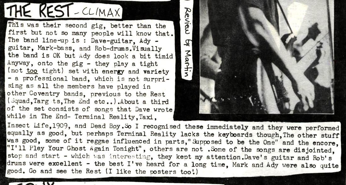Not long after I met them, the band split for the first time and Steve Harrison asked me to bring some of my lyrics down the the Queens near what is now the Cashbah in Coventry one Sunday for his new band Nack Ed En. When I got there, the band were rehearsing but there was no sign of Steve! I told them why I had come and that Steve had told me to come down. However they explained that Steve had been replaced by John Bradbury (who ten years later would be in the Specials!). He was a great drummer even then and I stayed to watch the band. The guitarist, Loz Netto became a good friend and later played in Sniff and the Tears (he’s on the single – Driver). The bass player was Neil Richardson who played with Ted Duggan afterwards in Drops of Brandy.