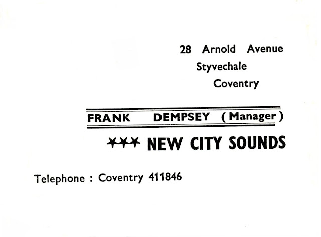 While I was running Hobo Magazine in Coventry c1973, I was introduced briefly to Frank Demsey – who gave me the above band card – strangely actually on the Broadgate Island where they were photographed!