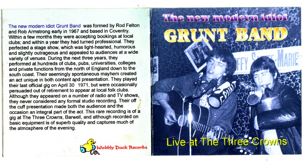 The New modern Idiot Grunt Band was formed Coventry in 1967 by Rod Felton and Rob Armstrong. Both of them are Coventry folk legends and further information will be on this site. By 1968 the new Modern Idiot Grunt band had turned professional. Their lighthearted and fun jug band style and zany humour ignited folks and over the next three years they performed at hundreds of clubs, pubs, colleges, universities and private functions all over the country. “Their seemingly spontaneous mayhem created an act unique in content and presentation.” The did their last gig on April 30th 1971. Although they played on a number of radio and TV shows they never did any formal recording. However their act has been preserved in the form of a live album recorded at the Three Crowns, Barwell on the wobbly Duck label. twelve live tracks available for download at 55p each! Download’s available for Dando Shaft’s Raremusez basement site (along with tracks by Dando Shaft and Rob Armstrong). The grunt band also played in Germany as can be seen in the cutting below.