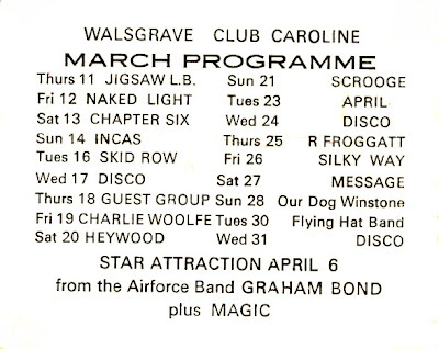They also supported Birmingham band Tea & Symphony at the Coventry Arts Umbrella Friday 21st August 1970. Also down to play Club Caroline – Walsgrave (Pete Waterman’s venue) March 1971. although this was cancelled along with the Umbrella gig owing to the split. They also played the Walsgrave June 2nd 1970 with East Light. 1971 Warwick University Arts Festival saw them playing a folk concert (Saturday March 6th) with Jeremy Taylor and Jo-Anne-Kelly. They played The Village (Colin Campbell) sat 26th Dec 1970.