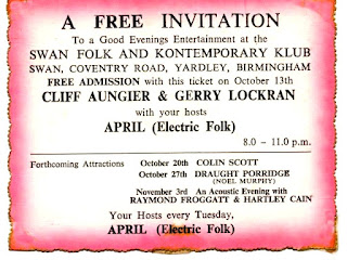 April were the hosts every Tuesday at the Swan Folk & Kontemporary Klub, Yardley Birmingham and supported acts such as Cliff Aungier & Gerry Lockran.