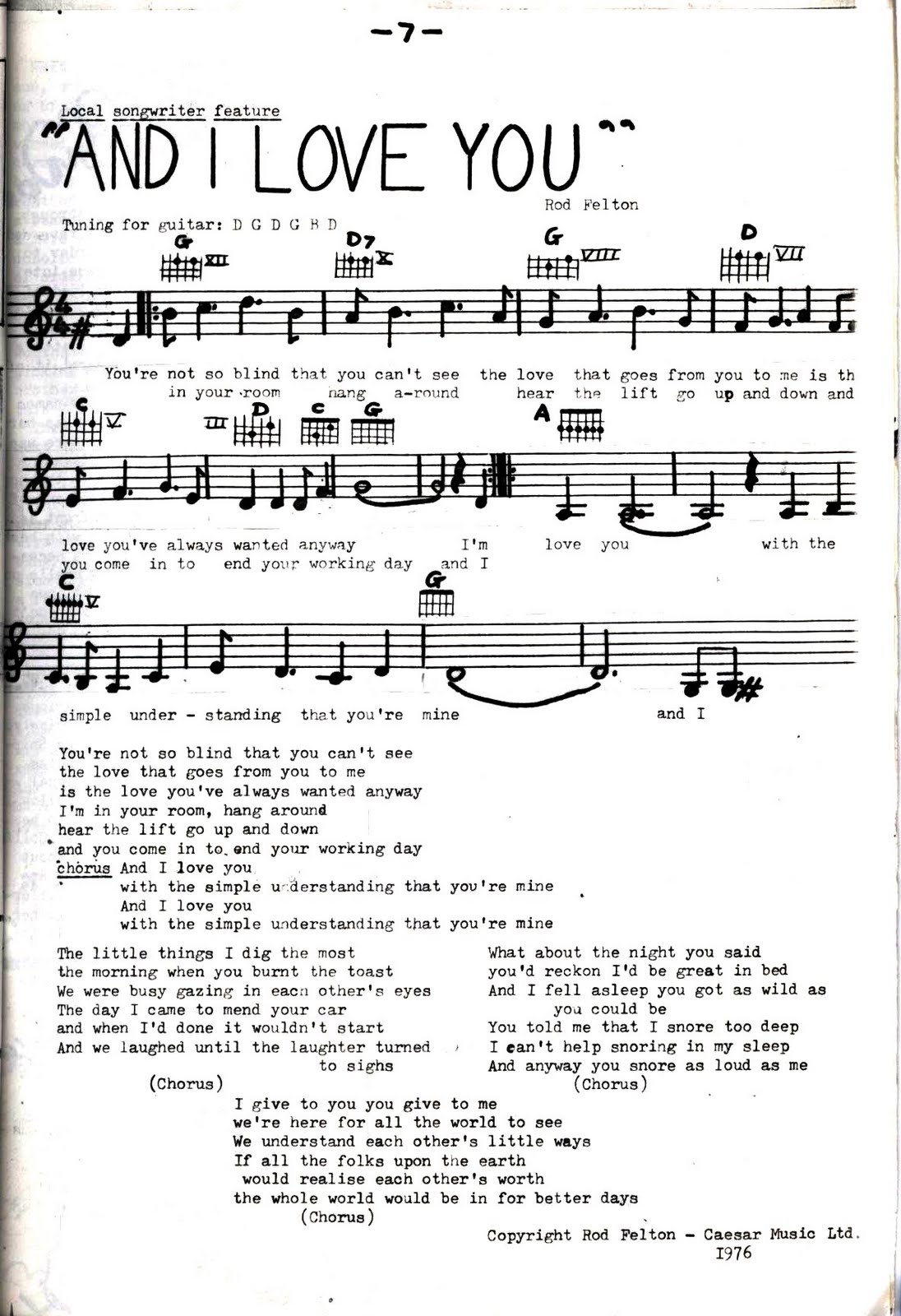 One of his most popular songs of the early 70’s – “And I Love You” ( played in open D tuning. He’d sing the verses soft as if singing to his lover and then for the chorus would bring in his considerable vocal power. Pete Willow tells me that several Coventry singers covered this popular Coventry song. First published in Folks – Pete Willow’s Coventry folk magazine 1979.