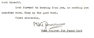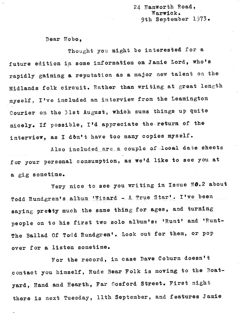 In September 1973 Hobo got a letter from the manager of singer songwriter Jamie Lord. Jamie, who would describe his music as ‘Cosmic Folk‘, didn’t fit neatly into the traditional folk circuit. None the less, this 24 year old Warwick based talent was highly popular in folk clubs such as Rude Bear (run by Rod Felton and Dave Coburn) and a growing reputation on the Midland Folk circuit. An advert in Hobo says that Jamie was managed by Mick Donovan in Colliers Wood, London. Mick Donovan wrote to Hobo in 1974 – (letter included here)