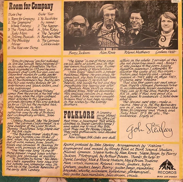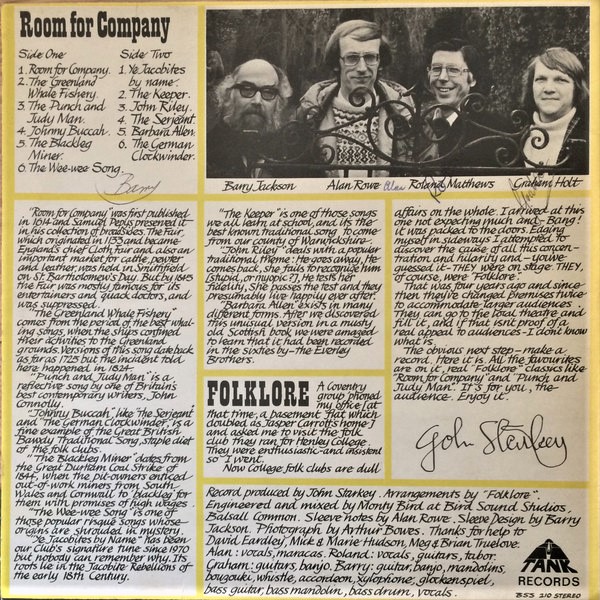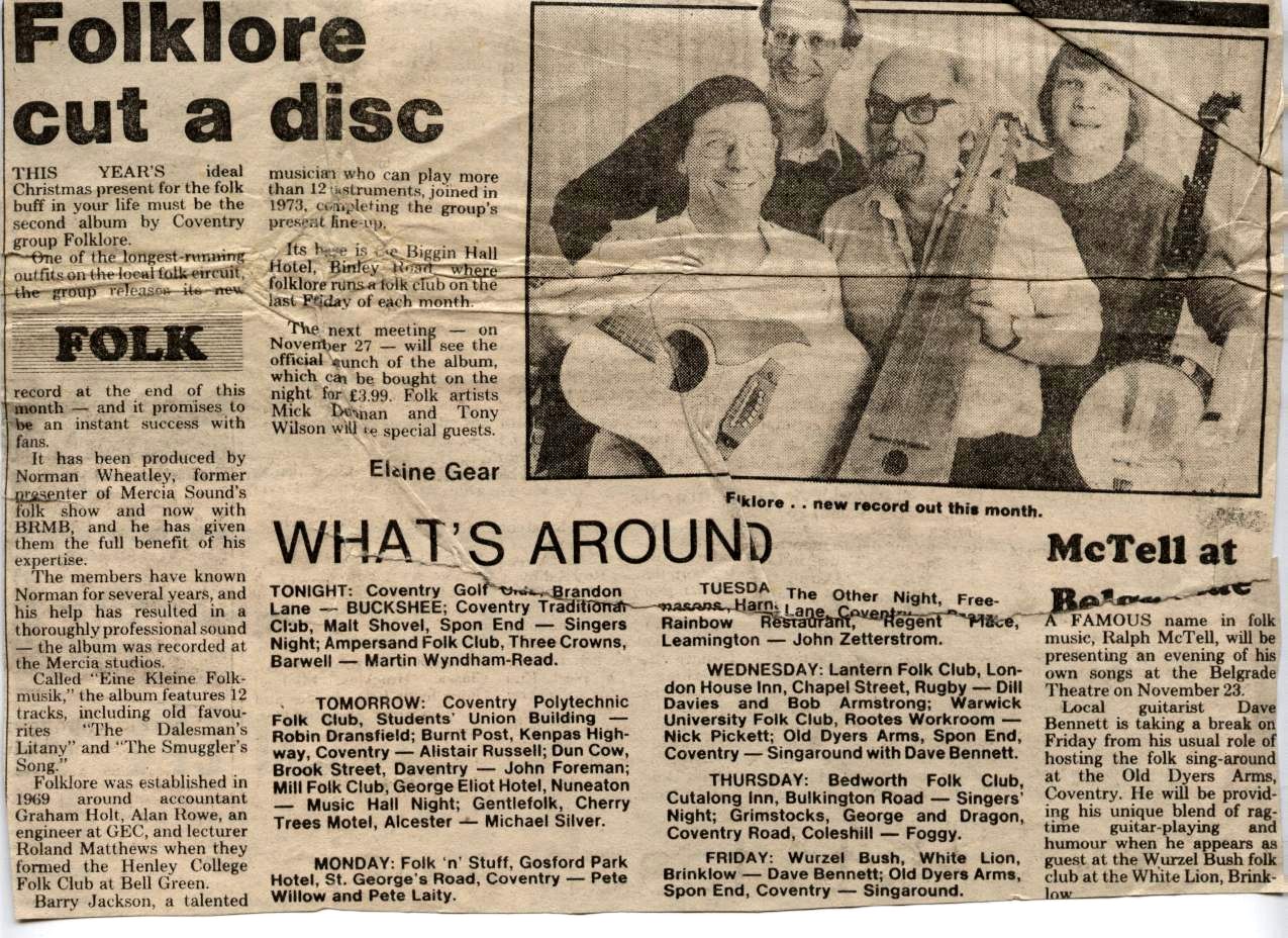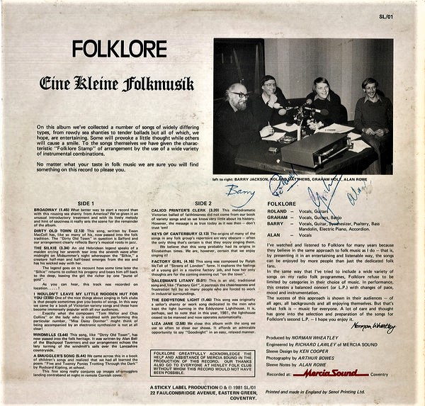 The band were formed around accountant Graham Holt, GEC Engineer Alan Rowe, Henley College lecturer Roland Mathews and artist / art lecturer / musician Barry Jackson who could play more than 12 instruments – Barry Joined in 1973. Their 2nd album was called Eine Klein Folk and was produced by local radio presenter (Radio Mercia/ BRMB / singer songwriter / poet Norman Wheatley. Norman was the organiser of folk sessions at the Coventry Arts Umbrella in the early 70’s and a prominent member of the Umbrella poets.