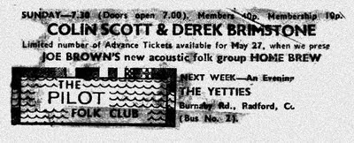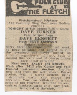Jazz fan then and now following Dud Clews (Mercers Arms), Tieano?(Sp) Bueno(Cottage Earlsdon, Monday) put well off Folk by Ian Cambell gig in Coventry which I found very boring and with Ross Patterson and Ray Fiddler? were thrown out by the heavies for not showing respect.