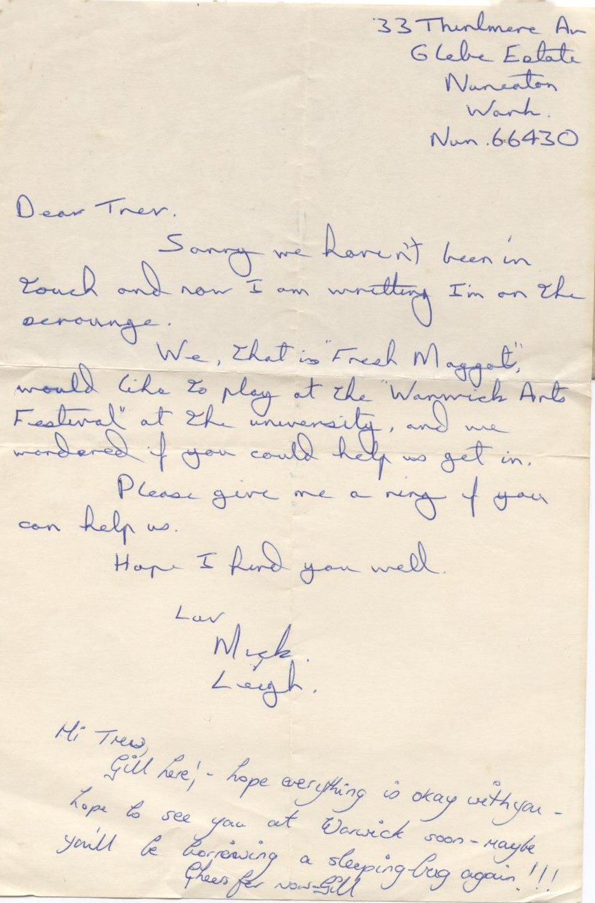 The reports of the festival at Warwick given by there girlfriends were so good Mick and Leigh wrote to me to ask me to help get them a gig at Warwick (see letter) and i remember going over to the student union office to sing their praises! It wasn’t any kind of burden as I really loved the music of Fresh Maggots and still do.We went off to see the bands and they told me they had come to try and get a gig at the University of Warwick for Fresh Maggots. I took them down to the Student Union office and told them about how well they had gone down at the Umbrella Club.