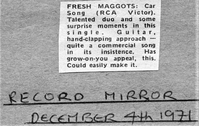 their career. The record was ‘The Car Song‘ by the deliciously titled Fresh Maggots, consisting of lifelong friends Leigh Dolphin and Mick Burgoyne. The band got their interesting name when reading the Tribune and spotting an advert for Riley’s Sports shop proclaiming “Fresh maggots always available”.