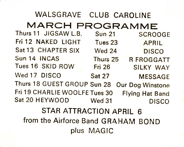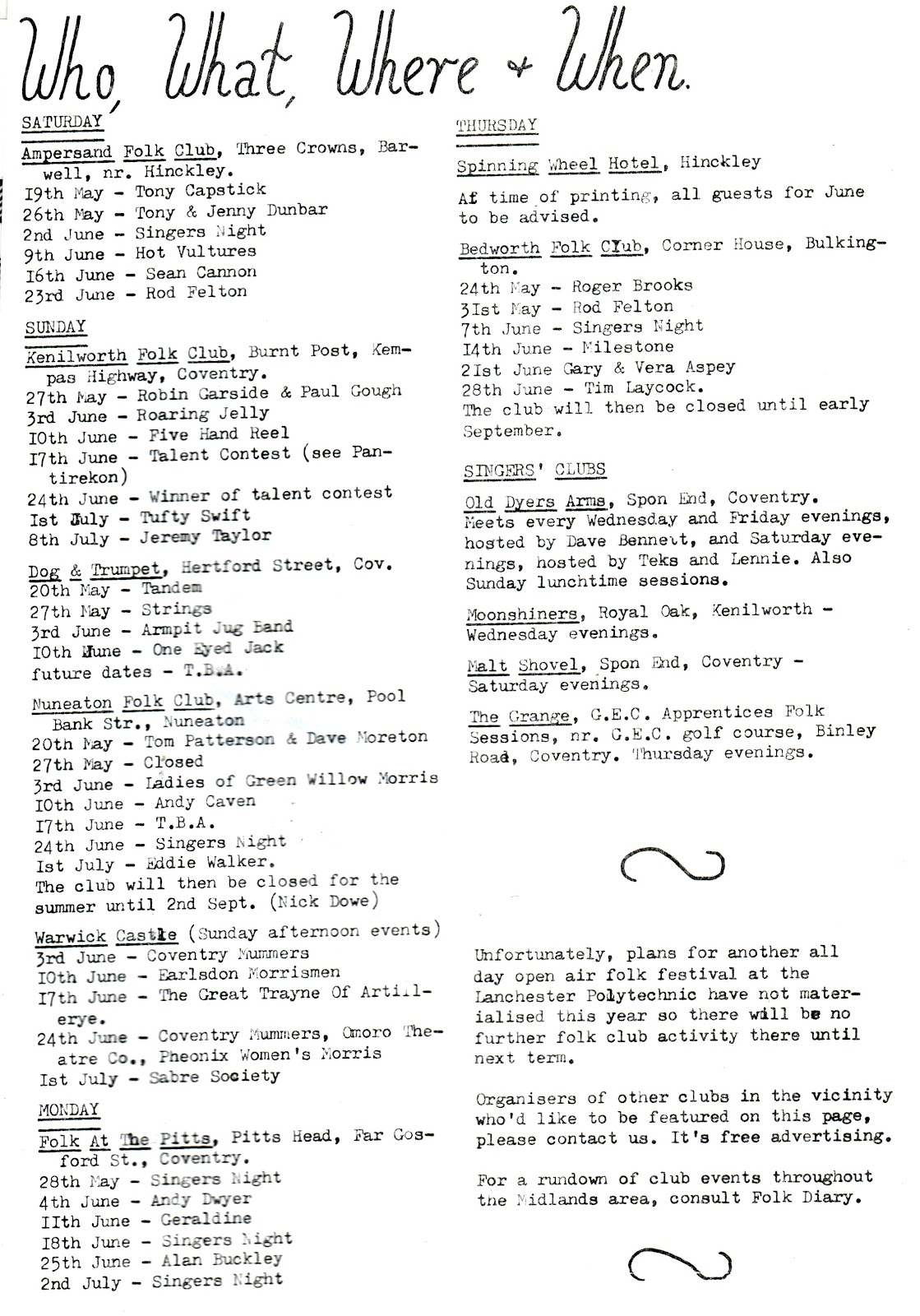 For a quick run down of what else was happening in the Coventry folk scene, the following list of clubs may bring back some interesting recollections from readers;