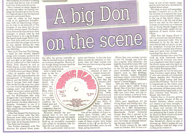 Finally Don is, of course, pivotal in the current version of the reformed Sorrows whose success just seems to go from strength to strength. After invited visits to Italy, Spain and various UK Mod weekenders during 2012 the band are preparing for a series of similar dates for 2013 which will mark the bands 50th anniversary.