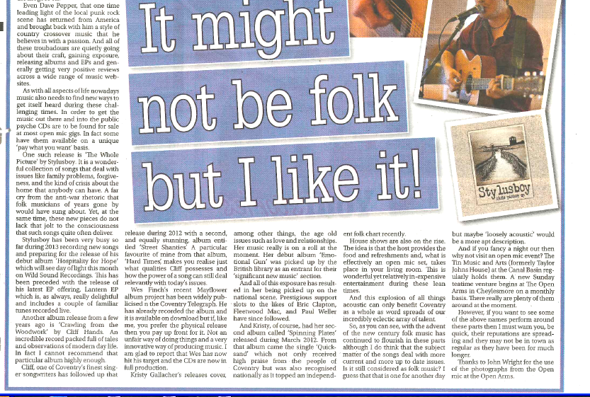 And Kristy, of course, had her second album called ‘Spinning Plates’ released during March 2012. From that album came the single ‘Quicksand’ which not only received high praise from the people of Coventry but was also recognised nationally as it topped an independent folk chart recently. House shows are also on the rise. The idea is that the host provides the food and refreshments and, what is effectively an open mic set, takes place in your living room. This is wonderful yet relatively in-expensive entertainment during these lean times.