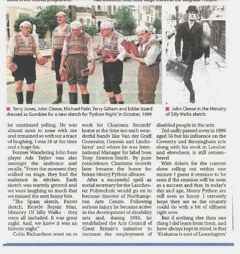 Pete Clemons also followed on with a great article on the story of Colin’s historic Python scoop for the Coventry Telegraph which hit the press last Monday and is re-presented here for posterity and those who didn’t see it. However, there is an oversite in that Pete inadvertently merged a eye witness account of the Python performance with an anacdote by myself. Although i went to most of the Lanch events and witness the Gumbies leaving the Lanch poly with knotted hankerchiefs on their heads, marching down priory street to the Belgrade Theatre, it was a Nuneaton Observer journalist (an old school pal) Chris Applebey who actually saw the performance and interviewed John Cleese. Pete forgot to attribute that bit to Chris, so we mention it here.
