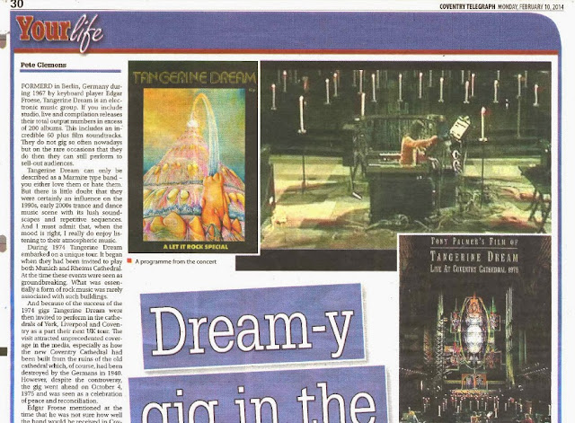 And because of the success of the 1974 gigs Tangerine Dream were then invited to perform in the cathedrals of York, Liverpool and Coventry as a part their next UK tour. The visit attracted unprecedented coverage in the media, especially as how the new Coventry Cathedral had been built from the ruins of the old cathedral which, of course, had been destroyed by the Germans in 1940. However, despite the controversy, the gig went ahead on October 4, 1975 and was seen as a celebration of peace and reconciliation.