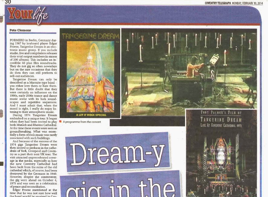 And because of the success of the 1974 gigs Tangerine Dream were then invited to perform in the cathedrals of York, Liverpool and Coventry as a part their next UK tour. The visit attracted unprecedented coverage in the media, especially as how the new Coventry Cathedral had been built from the ruins of the old cathedral which, of course, had been destroyed by the Germans in 1940. However, despite the controversy, the gig went ahead on October 4, 1975 and was seen as a celebration of peace and reconciliation.