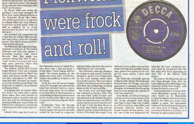 | ” DID fabulous Coventry beat group The Pickwicks lose out on chart success because their B-sides were better than their A sides?“ TONY MARTIN and His Echo Four had been playing the local and national circuits, including a prime show at Coventry Theatre supporting Brian Poole and The Tremeloes. Local impresario Larry Page spotted them and so began the image building. Tilzer song that had been recorded by The Andrews Sisters among others). freakbeat unit they were. Bradford’s Fat Black Pussycat Club was more memorable than most. record, it was a guy called Harry Friar.