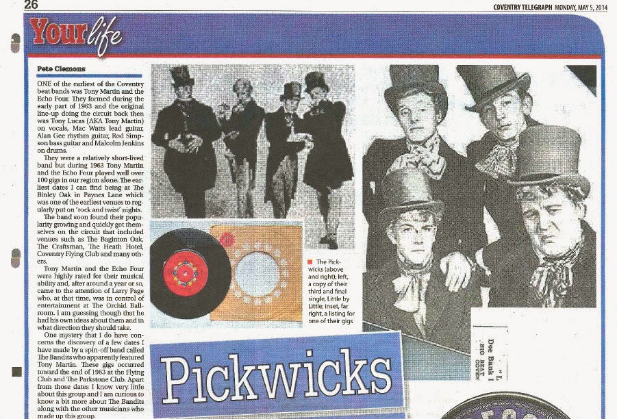 Pete Clemons visitation to the Coventry music scene once again – this time with a Coventry Telegraph article on Tony Martin’s Echo Four and The Pickwicks – both managed by Larry Page c 1963 / 64.