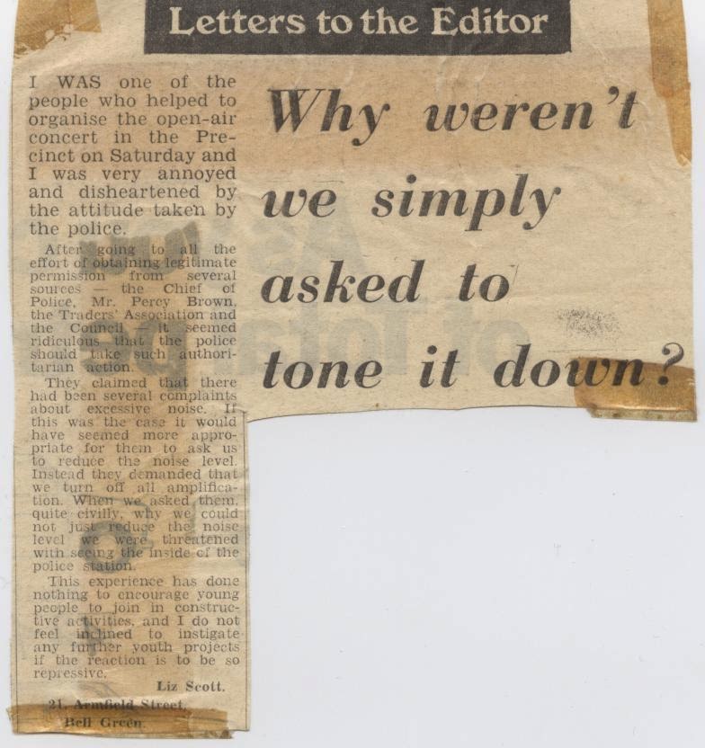 People were then encouraged to sign a petition or write letters.The equipment had barely been cleared away when someone produced a lunch time edition of the Coventry Evening Telegraph – the concert was on the front page with the headline Concert Deafens Shoppers. Of course this came as a complete surprise to the organisers who had only noticed scores of people enjoying themselves.