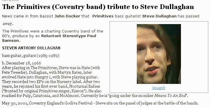 with each other again and which ultimately led to the band’s reformation. This of course was the untimely death of the band’s founding member and bass player Steve Dullaghan. (Hobo magazine did a tribute to Steve here http://coventrymusichistory.typepad.com/blog/2009/02/the-primitives-coventry-band-tribute-to-steve-dullaghan.html