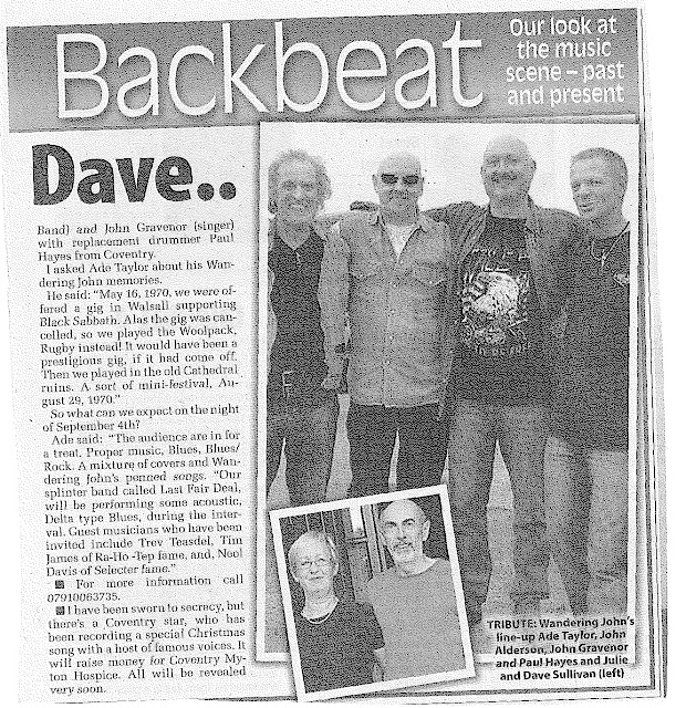 Ade said: “The audience are in for a treat. Proper music, Blues, Blues/Rock. A mixture of covers and Wandering John’s penned songs. “Our splinter band called Last Fair Deal, will be performing some acoustic, Delta type Blues, during the interval. Guest musicians who have been invited include Trev Teasdel, Tim James of Ra-Ho -Tep fame, and, Neol Davis of Selecter fame.”