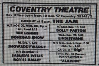 At the time of the release of ‘All Mod Cons’ The Jam were still in their ascendancy. Such was the sudden growth of their following at that time meant that, for the Apocalypse Tour, the band were suddenly moved up from playing smaller venues such as The Locarno/Tiffany’s to the larger, grander seated theatres such as the Coventry Theatre.
