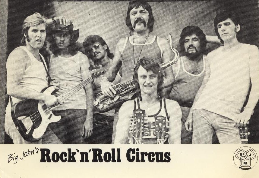 The Circus very much reflected Big John’s sense of humour. Apparently the laughs they had during the two week rehearsal to put the show together persisted right to the end, almost fifteen years later, and his high standards of musicianship. Basically, it was a cabaret-review of Rock & Roll from Elvis to the Beach Boys packed into two one-hour shows complete with fireworks, smoke bombs and ‘dancing girls’.