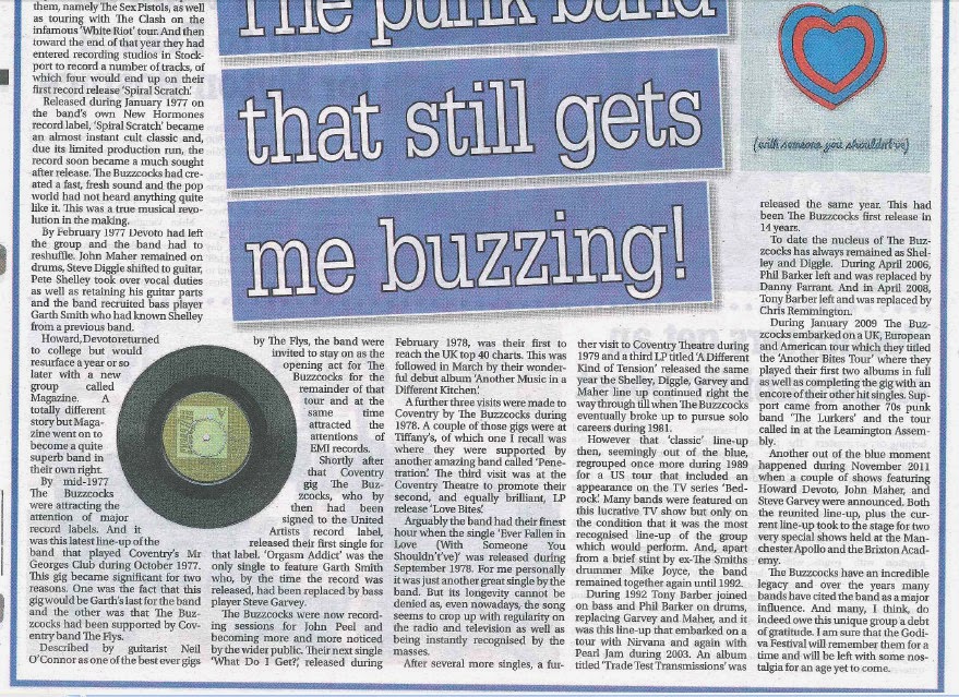 Pete Clemons with his latest article for the Coventry Telegraph. They recently played the Godiva Festival and back in the 70’s they played Mr Georges with Neil O’Connor’s punk band – The Flys who continued to tour with them after that. I saw the Buzzcocks gig at Tiffany’s with Penetration c 1978.