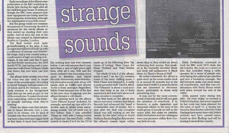 Delia passed away during July 2001. Yet even today, so revered is Delia Derbyshire, that a tour inspired by her work has been planned for the week of April 12. A female trio based in Manchester called the Delia Darlings have spent time with Delia’s archives and have created music based on their findings and will be touring it around the country.
