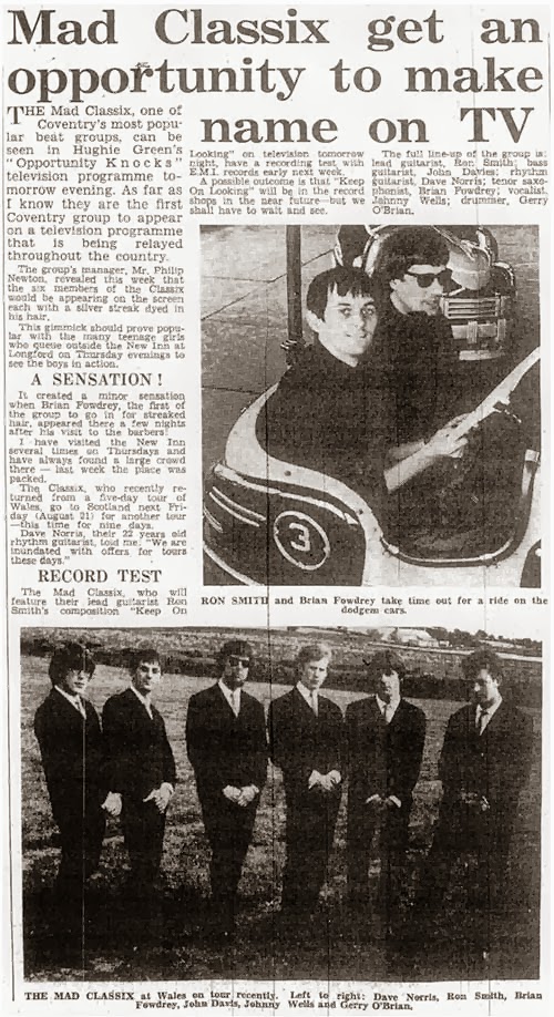 The Mad Classix was another of Coventry’s popular beat groups who existed from the early to mid 1960s. And August 1964 saw them appear on Hughie Green’s version of Opportunity Knocks. As far as I can ascertain they were the first Coventry group ever to appear on a television programme that was relayed nationwide throughout the country.