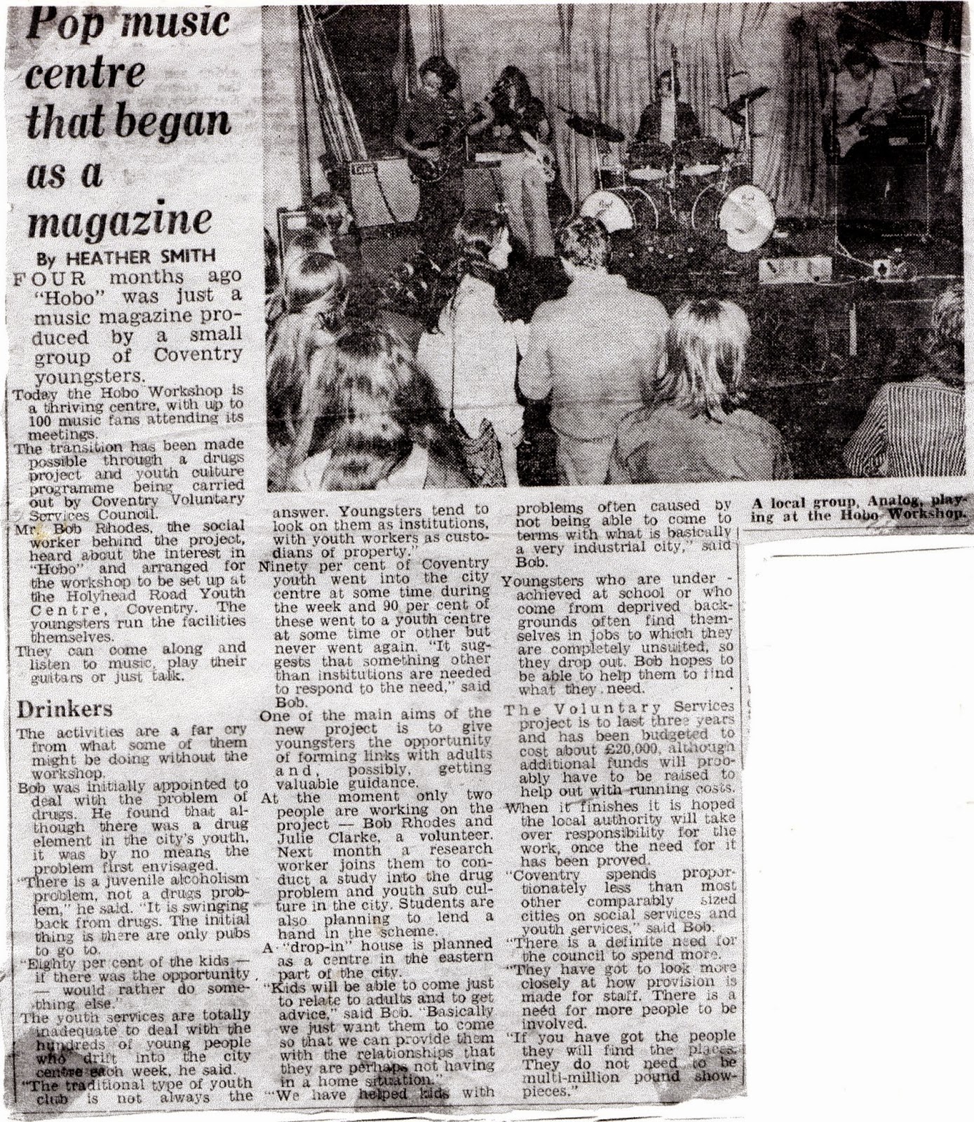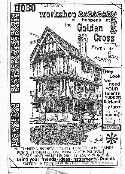 The Hobo Workshop came about via a link-up between Hobo – Coventry Music and Arts Magazine and the City Centre Project via Coventry City Voluntary Service (CCVS) after an executive meeting of the Coventry Arts Umbrella (known to users as The Umbrella Club or The Brolly) in May 1974 at the premises of CCVS at Tudor House, Spon Street.