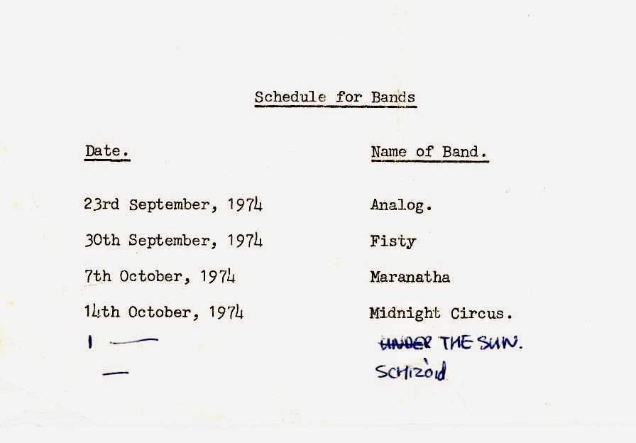 A few of the bands who played at the Hobo Workshop on a Monday night 1974. Fission was Johnny Adams’s band – later in Squad – Terry Hall’s first band.