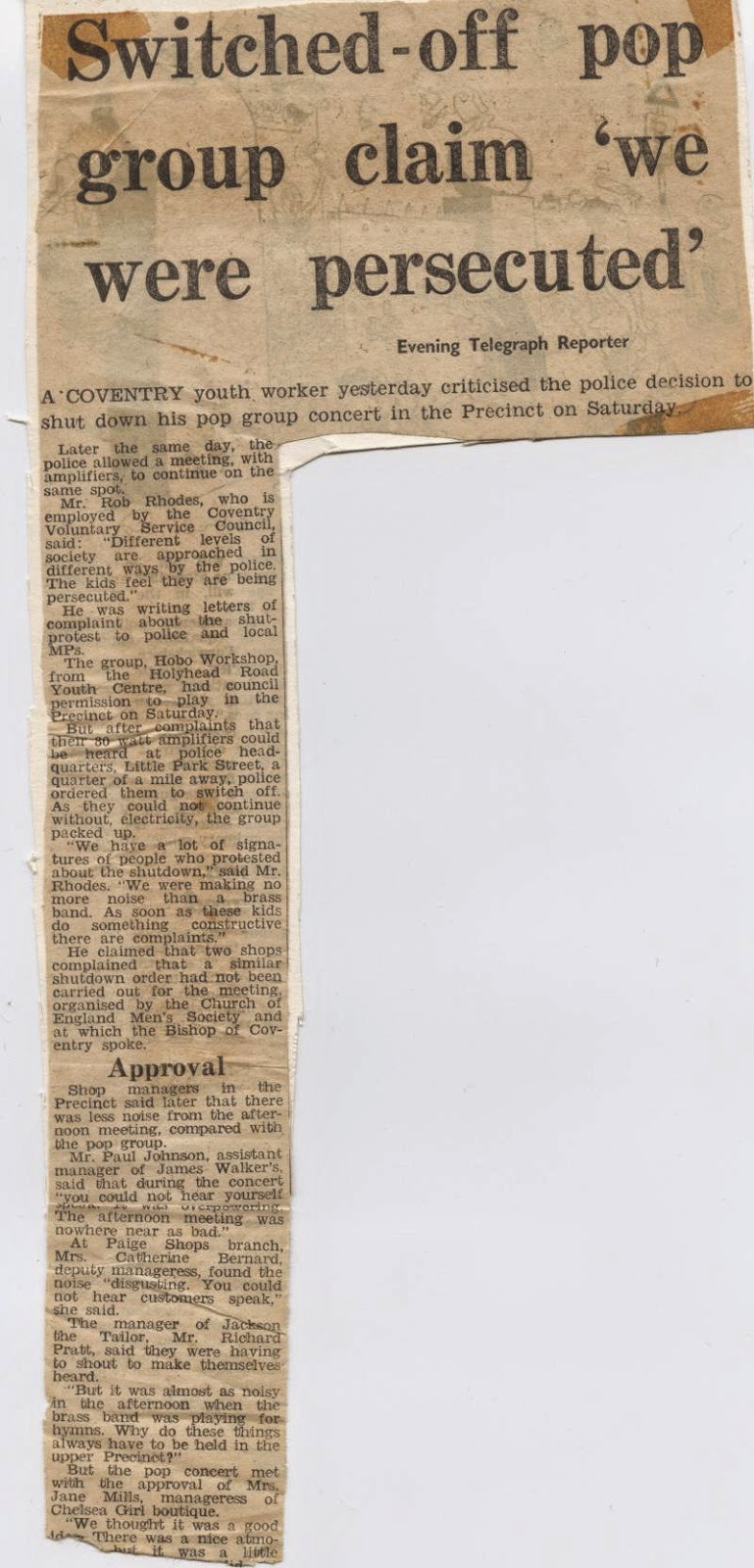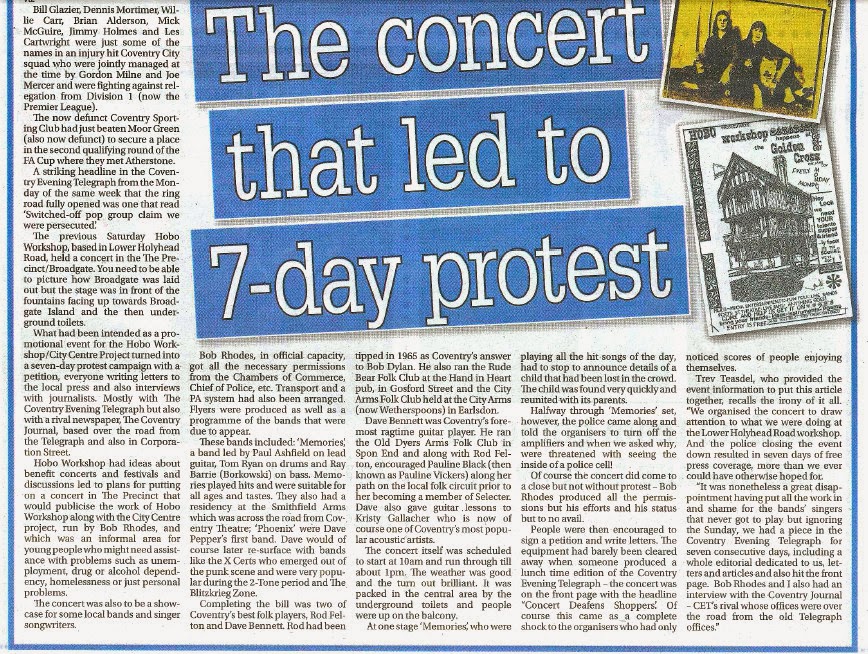 One of the aims of Hobo magazine had been to create a venue to help get new bands and artists started and for creative activities like Street theatre, alternative films, jam sessions and much. It was facilitated and supported by the City Centre Project – a youth project created by Coventry Voluntary Service Council to help young people with problems of homelessness, unemployment, alcohol or drug dependency etc. Bob Rhodes, the Detached Youth Worker needed to reach young people who maybe in need of help and Hobo magazine had identified a number of youth problems. Bob therefore worked with us and in doing so facilitated our wider aims to provide a venue and facilities for budding musicians in the city. In order to publicise the work and the gigs, we collectively organised a Saturday concert in the centre of Coventry with a number of bands and a couple of folk performers identified in the article. However the concert was closed down by the police and a 7 day protest in the press ensued – the cuttings are below and Pete Clemons tells the story. Below is a readable version, split into two parts so the small print can be read.